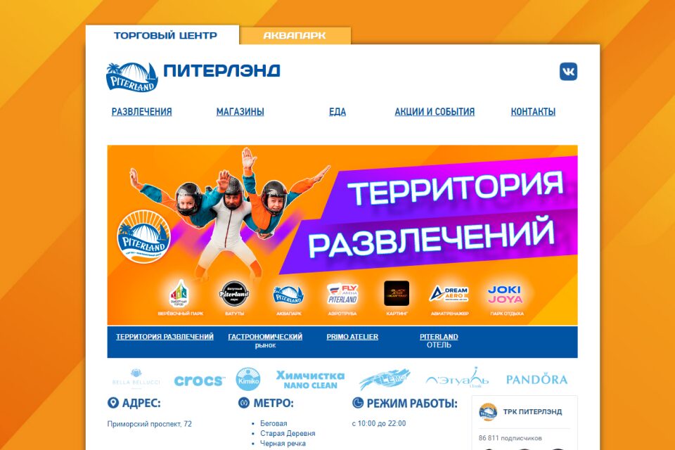 «Питерленд», расположившийся на берегу Финского залива — это не только 7 этажей магазинов, но и огромный центр развлечений для всей семьи. Здесь есть аквапарк с комплексом бань и саун, картинг, скалодром, батутный и веревочный парки, кинозал IMAX Sapphire и даже собственный эко-отель с панорамным рестораном. Что касается шоппинга, на территории представлены многочисленные бренды одежды, а также детейлинг, химчистка, маникюрный салон. На фудкорте посетителей ждут кафе, где можно перекусить и отдохнуть. ТРЦ регулярно проводит праздничные мероприятия, где гостей ждут приятные подарки.