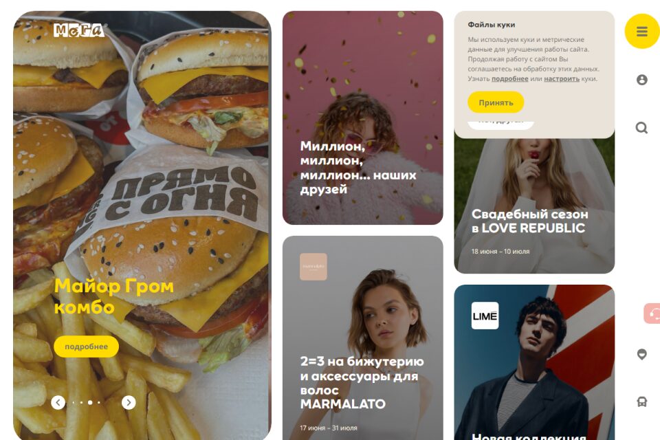 Несмотря на свое загородное расположение «Мега» пользуется большой популярностью. Петербуржцы приезжают не только на шоппинг, но и просто погулять и приятно провести время. На территории размещены 163 магазина, кинокомплекс, 25 точек питания на фудкорте и крытый каток, где можно покататься самостоятельно или взять уроки фигурного катания. Для юных гостей действует детский клуб с различными тематическими мероприятиями и игровые площадки. Если гости приходят с питомцем, комплекс предоставляет коляску (для животного весом до 10 кг) и миску с водой. Отдельно стоит отметить «МЕГА парк» — пространство для активного отдыха и выгула собак. Удобный сайт позволяет ознакомиться с полной информацией о магазинах и сервисах, а также с полезными статьями и советами от стилистов.