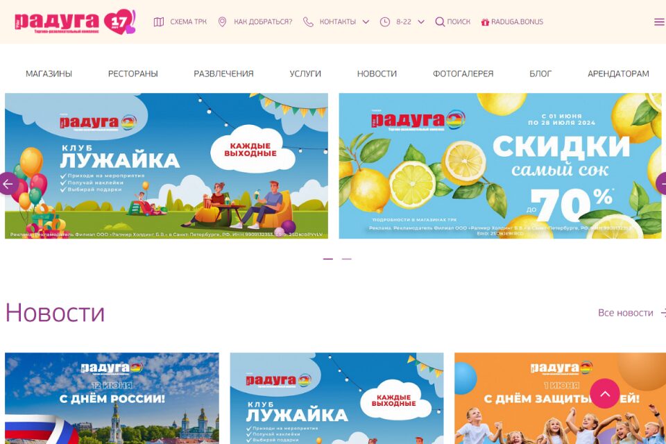 Больше 250 магазинов, кафе, ресторанов и развлекательных зон объединились на территории яркого торгового комплекса. Для самых юных посетителей здесь работает детский город профессий «КидБург», музей занимательной науки «ЛабиринтУм» и семейный парк активного отдыха «Joki Joya». Родителям не придется уговаривать ребенка ехать на шоппинг, он сам потянется в «Питер Радуга». Приятно отдохнуть позволит живая музыка в ресторанном дворике. Администрация ТРК регулярно проводит конкурсы, мероприятия и ярмарки.