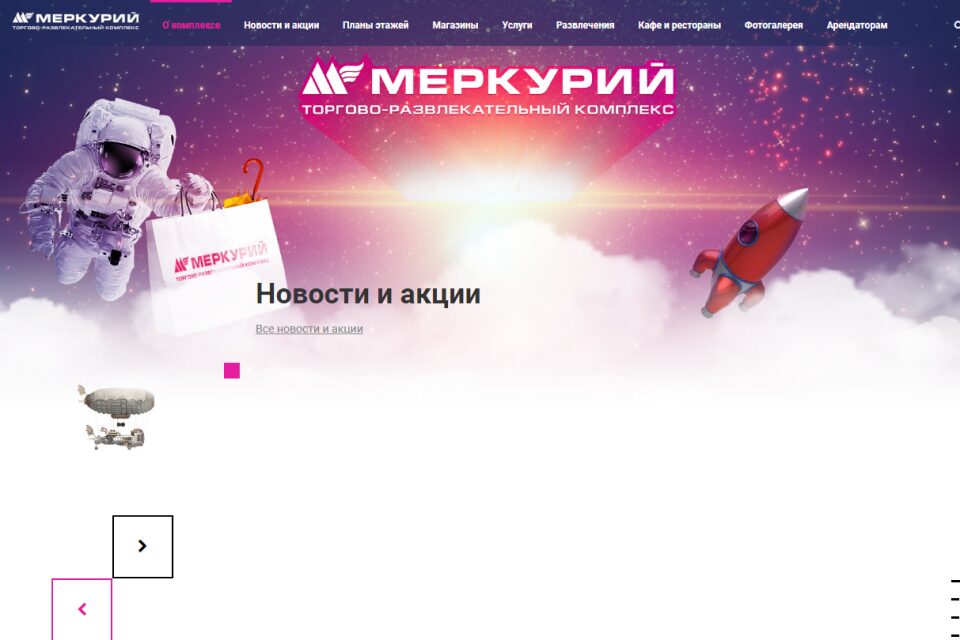 Для туристов, рыболовов и спортсменов – космического стиля торговый центр особенно активно продвигает товары для активного отдыха. «Меркурий» совмещает в себе торговый комплекс, спортивный клуб, кинотеатр, ледовый каток, боулинг, студия рисования песком, а также фудкорт с кафе и ресторанами различных кухонь. В ТРК часто организуют детские дни рождения с аниматорами.