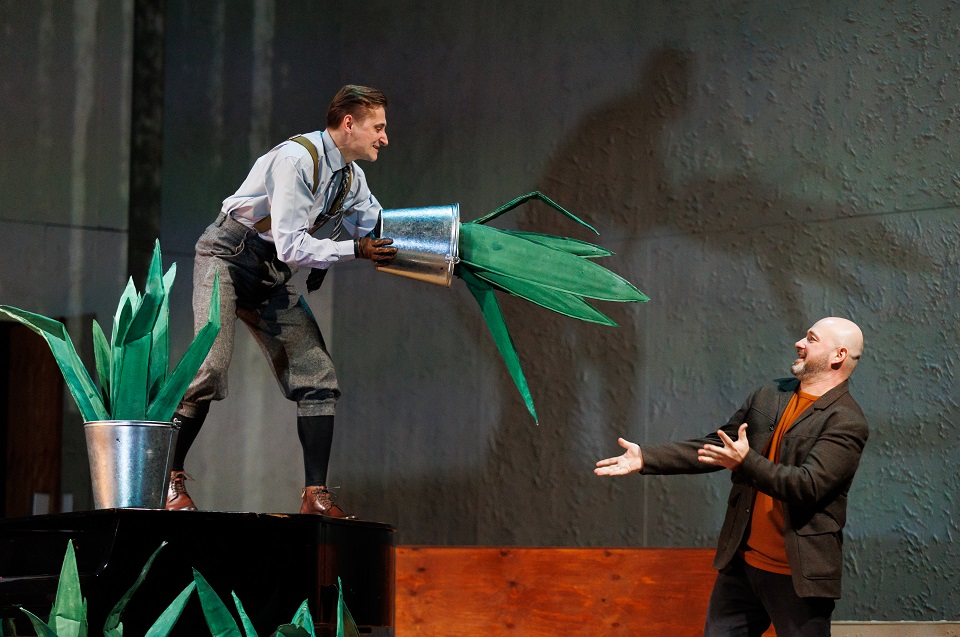Декорация художников Марии Лукки и Александра Мохова ничего веселого не предвещает. Круг сцены перманентно вращается, показывая то задворки дворянского дома, то его гостиную. Все тут какое-то необжитое и неживое, как будто это фойе ДК им. Крупской. Искусственные цветы в алюминиевых ведрах, деревянные скамейки вместо диванов. Железные лестницы вместо картин и занавесок. Даже в рояле нет струн. Его используют в качестве подиума для спичей и танцпола.