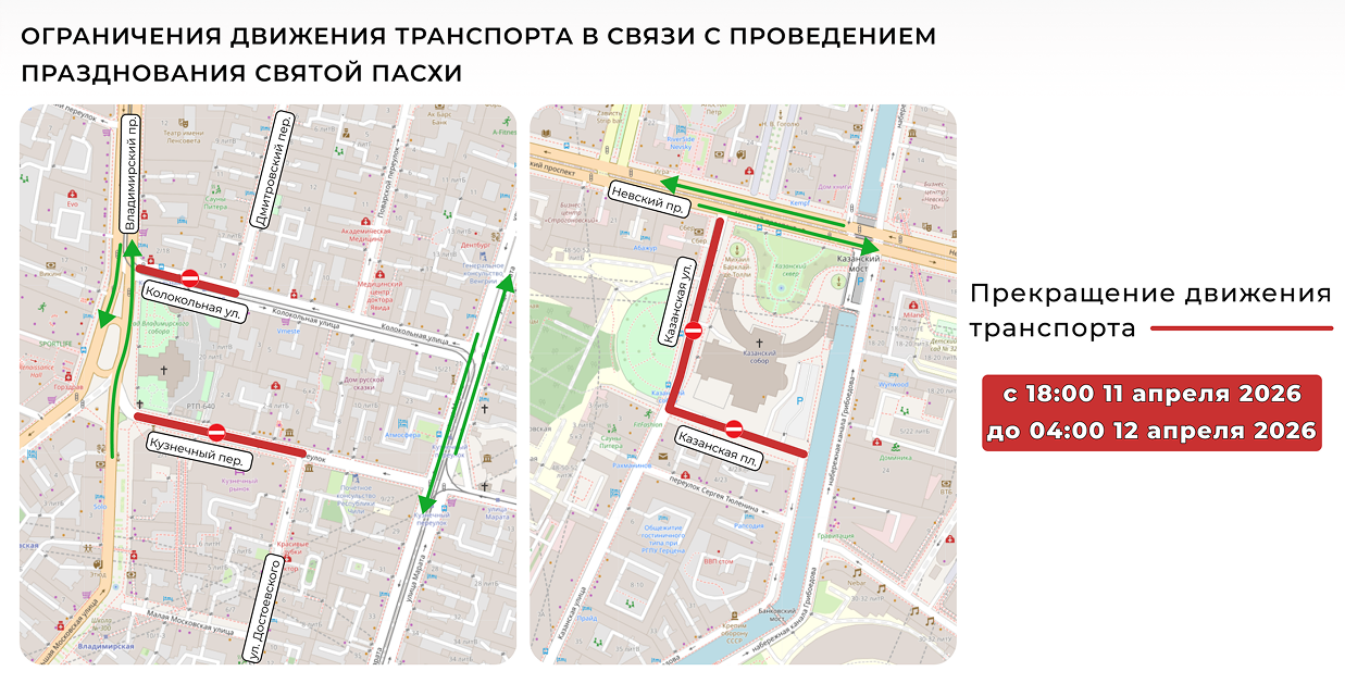 11 и 12 апреля 2026 года в Санкт-Петербурге планируется перекрытие дорог на Пасху. В православных храмах города ночью пройдет праздничное богослужение и крестный ход. Главная служба по традиции организуется в Казанском кафедральном соборе. Для безопасности прихожан проезд по близлежащим улицам на время ограничат.