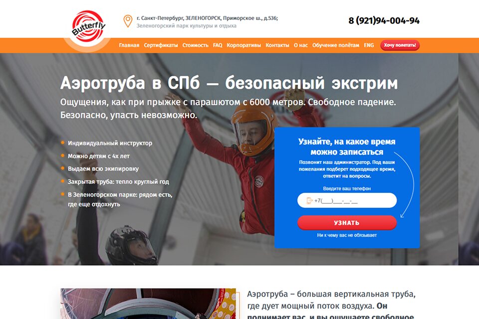 В компании Butterfly всем гостям обещают безопасный экстрим. В аэротрубе ощущения как при прыжке с парашютом с высоты в 6 000 метров, при этом полет абсолютно контролируем. Мощный поток воздуха поднимает человека на нужную высоту и за счет этого возникает ощущение свободного падения.