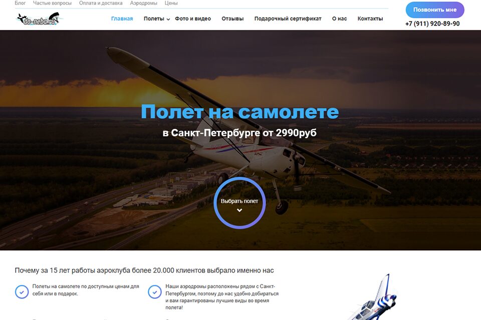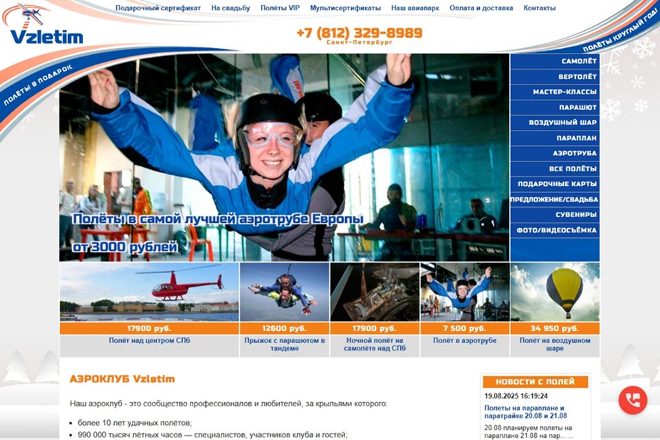 Аэроклуб «Небо Питера» предлагает клиентам различные виды активных развлечений. Полеты на самолете, вертолете, параплане. Желающие могут остановить выбор на аэротрубе.