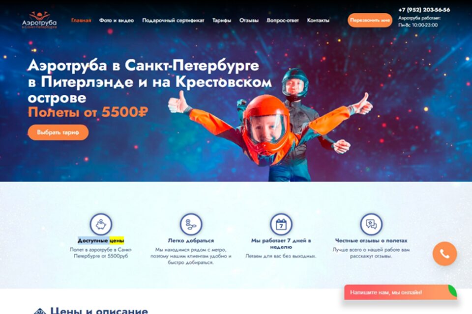 | «Аэротруба» | 4 минуты – 5 500 рублей, 5 минут – 6 500 рублей, 10 минут – 12 000 рублей, 15 минут – 17 000 рублей, 30 минут – 32 000 рублей, 60 минут – 55 000 рублей. Все полеты можно разделить по времени с другими участниками. |