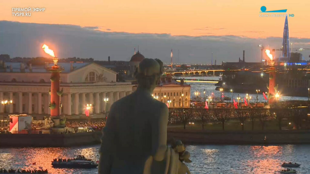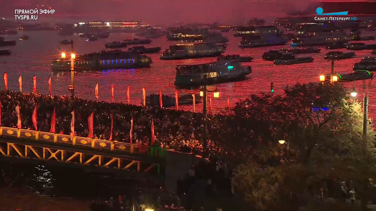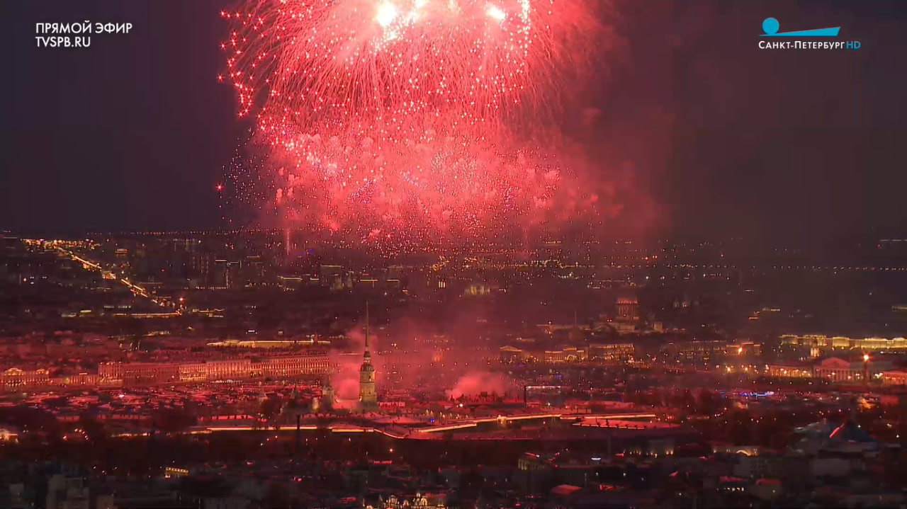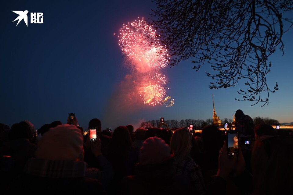 Еще до начала салюта в авкатории Невы собрались экскурсионные корабли, а пешеходы заняли места с лучшим обзором на мостах. Торжественности обстановки добавили и заженные Ростральные колонны. Ровно в 22:00 в небе над Санкт-Петербурге под восторженные восклили зрителей расцвели праздничные огни.