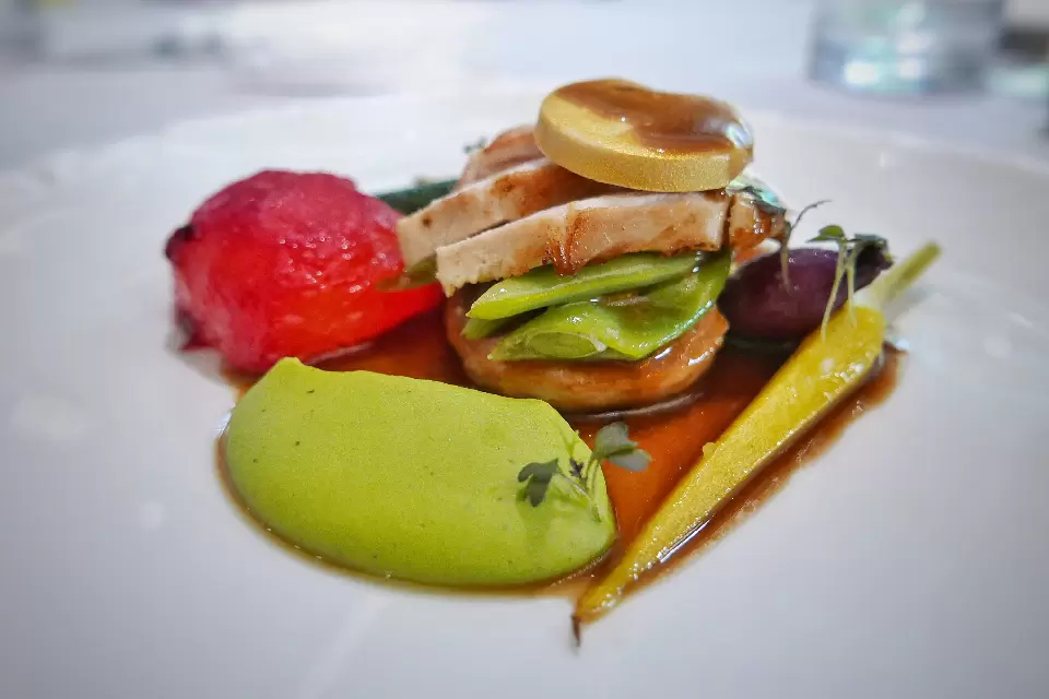 Про петуха с овощами, сливой, фуа-гра и соусом из мерло (это уже горячее) могу сказать, что такое я лично готов есть хоть каждый день. И помногу. Петух – моя слабость. Тут мы имеем и рулет из петушиного бедра, и кусочек его грудки су-вид. С одной стороны, можно было бы побольше поиграть специями, но тогда труднее было бы понять, что мясо петуха значительно вкуснее и интереснее куриного.