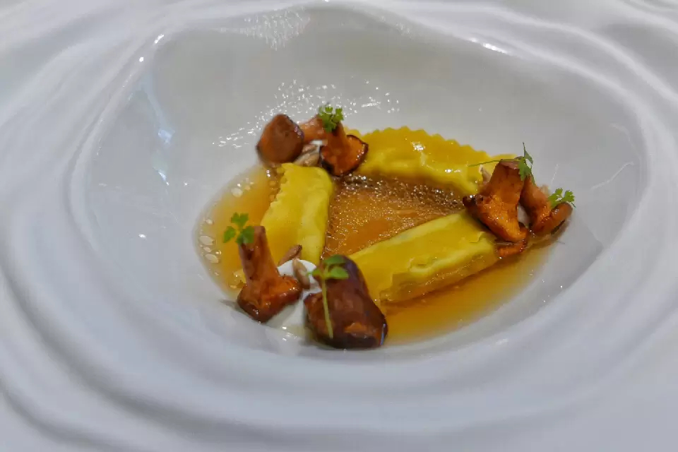Из горячих закусок были выбраны равиоли с начинкой из жареных кабачков и семян подсолнуха, которые предварительно были вымочены в молоке. В качестве соуса – крем из козьего сыра, плюс жареные лисички и снова семечки, но уже карамелизованные. Все это дополняется бульоном из кабачков, в который добавлено масло опять-таки лисичек (нетрудно заметить, что Фокин любит использовать в одном блюде компоненты в разных видах).