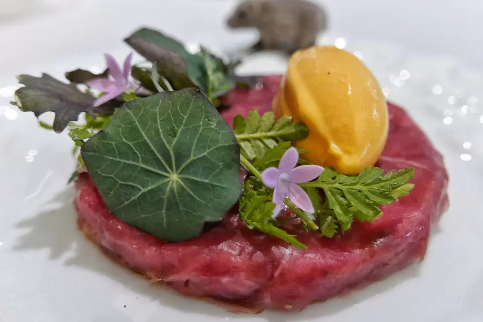 Как человек мясной ориентации я не мог пройти мимо говяжьего тартара. Тартар, как известно, очень хорош с каперсами. И они тут есть, но это каперсы из одуванчиков. Плюс крайне живописные травки и мороженое из печеного перца. Есть это полагается с маковым хлебом.