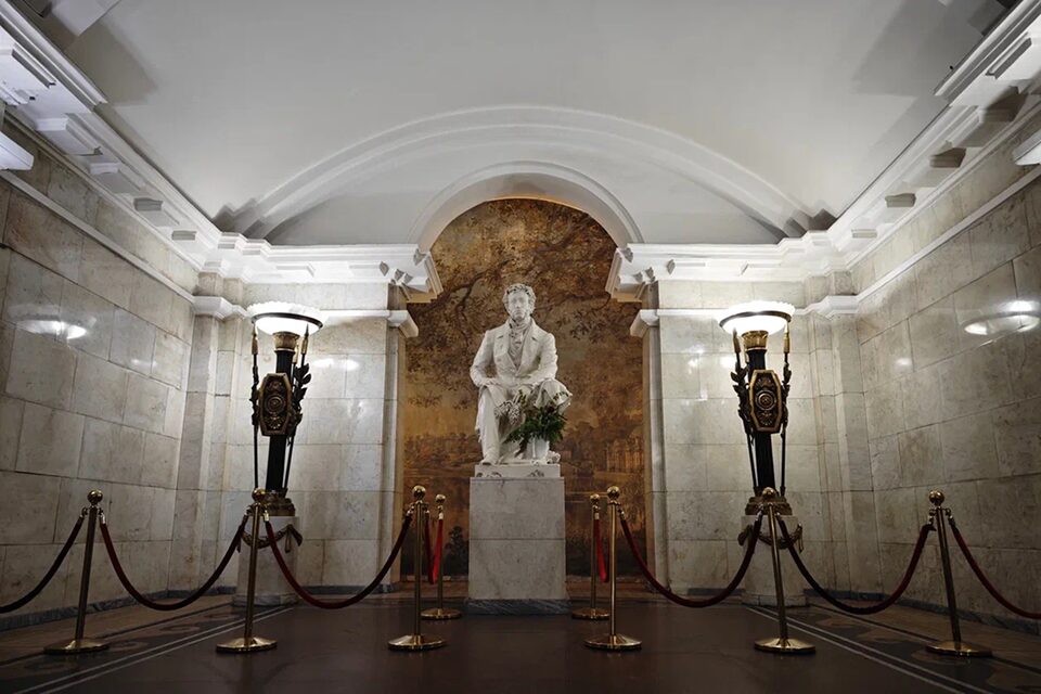 Открывшаяся 30 апреля 1956 года станция метро посвящена памяти великого русского поэта Александра Пушкина. Центральным элементом оформления здесь стала беломраморная статуя писателя, установленная в торце зала. Колонны выполнены из розового уральского мрамора, потолок украшен лепниной и плафонами с мягким светом. Стены облицованы керамической плиткой с растительным орнаментом.