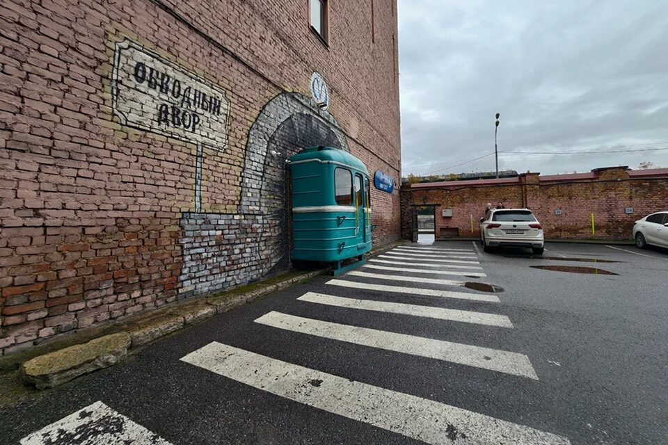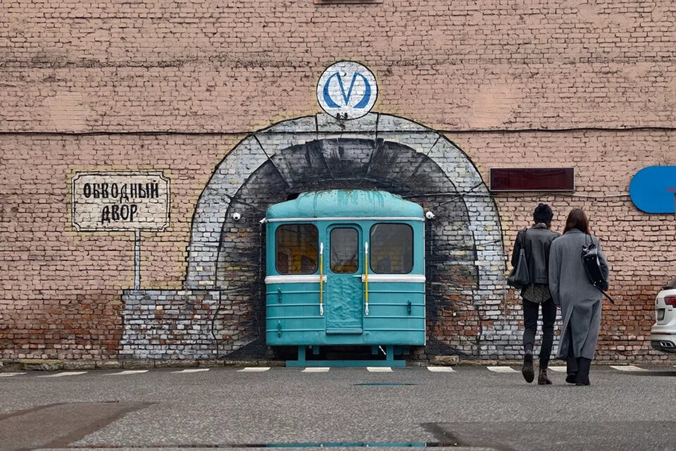Во дворе бизнес-центра «Обводной Двор» установлен реалистичный бутафорный вагон метро, въезжающий в стену здания. Граффити на стене воспроизводят детали метрополитена, а рядом висят часы, показывающие время и температуру, создавая ощущение маленькой городской сцены.