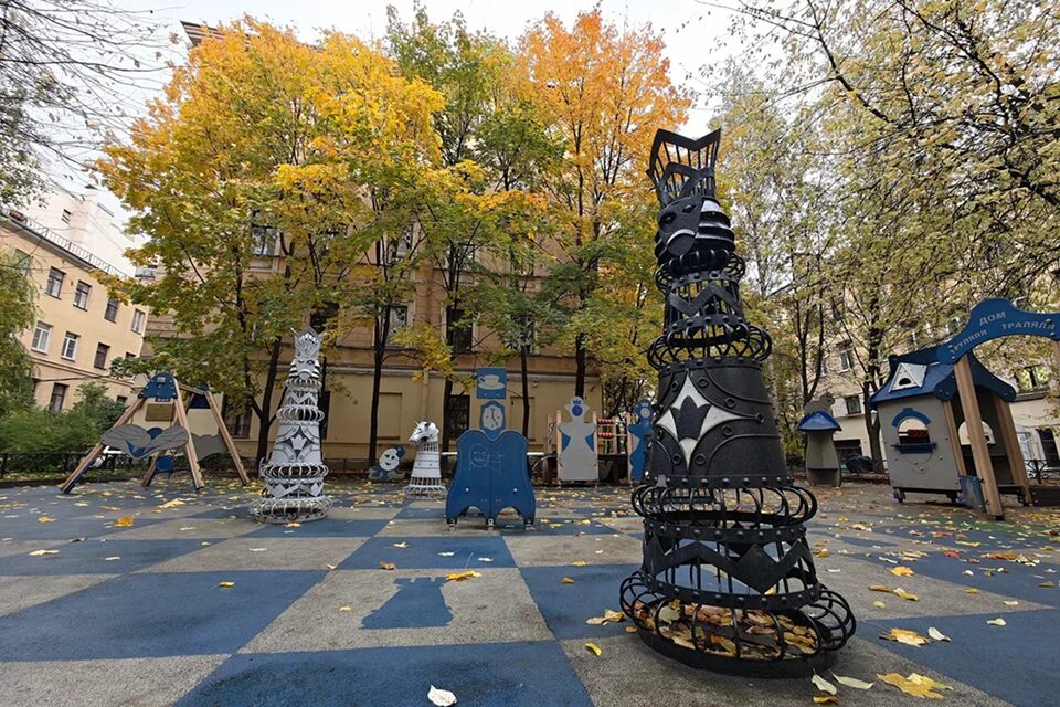 Этот дворик превращен в шахматную площадку под открытым небом: металлические ферзи, короли и пешки достигают почти половины роста взрослого человека. Дети рассматривают их снизу вверх, словно в мире великанов.