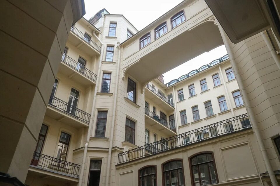 Доходный дом 1912 года с двумя парадными был спроектирован инженерами Дальбергом и Кохендерфером. Угловая планировка позволила скрыть сразу три двора-колодца, которые сохранились практически в первозданном виде. Эти глубокие внутренние пространства высотой около 18 метров производят слегка жутковатое впечатление – стены создают своеобразную игру света и тени, которая формирует ощущение тишины и отрешенности.