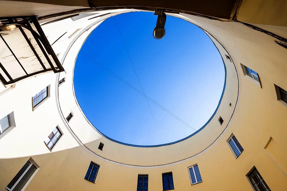 Внутренний шестиугольный двор «полтора на полтора» отличается камерностью: высокие стены словно сжимают пространство, создавая ощущение погружения в архитектурный колодец. Доступ во дворик открыт каждому.