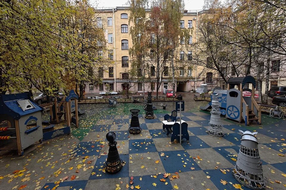 Окна двора с игровой инсталляцией украшены витражами на шахматную тему, а вокруг площадки расположены большие игрушечные автомобили, в которые любят залезать малыши. Попасть во двор можно, позвонив в домофон музея Римского‑Корсакова — вам непременно откроют.
