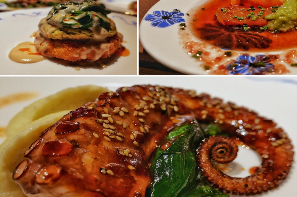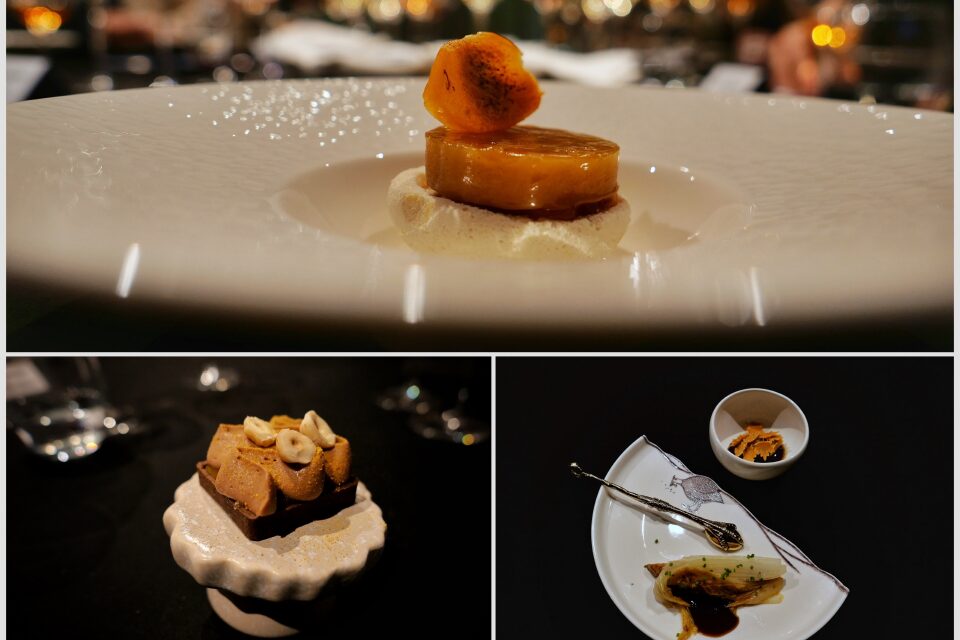 Дальше, на мой взгляд, вершина этого сета — зубатка в карамели мисо на слайсах цветной капусты и с соусом из устрицы. Тут все настолько небанально, что попахивает, знаете ли, некоторым гастрономическим авангардом. Сладкая рыба — каково? После этой зубатки выдержанная утка с соусом из сычуаньского перца кажется чем-то обыденным (во зажрались-то люди, да?), но кремоподобная полента — это нечто. Предесерт по мотивам и со вкусом Kir Royal, десерт — очень вкусный лунный пряник плюс трюфельные конфеты с белыми грибами.