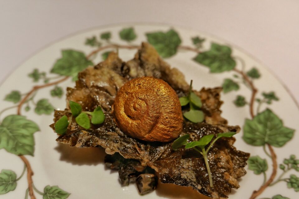 Дальше — виноградная улитка, один из знаковых французских продуктов, но в витиеватом исполнении. Золотистая ракушка сверху — это мусс из улитки, потом виноградный лист в кляре, а еще ниже — тартар из улитки и томат.