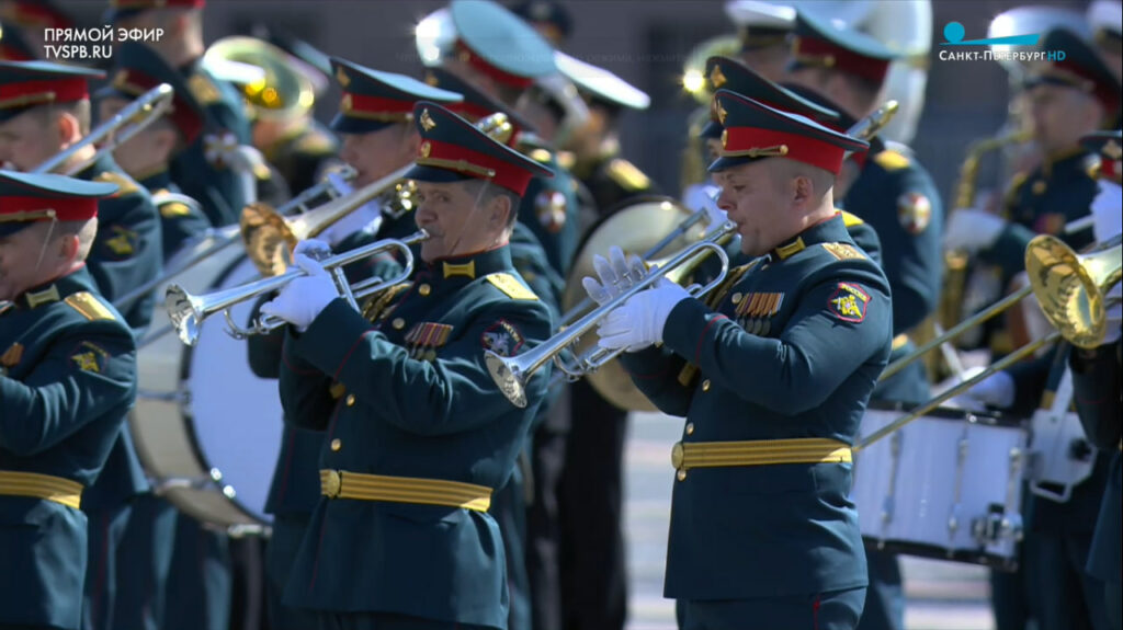 Затем была объявлена минута молчания в память о героях Великой Отечественной войны. После торжественной речи прозвучал гимн Российской Федерации и начался праздничный марш. Юные барабанщики задавали ритм парадным расчетам. Военнослужащие несли боевые знамена и штандарты фронтов, защищавших Ленинград.