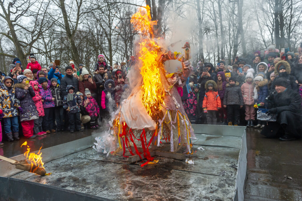 В завершении каждого часа в ЦПКиО сжигали небольшие чучела Масленицы, а главное, с «черным сердцем» и записками от горожан внутри него, всполыхнуло вечером.