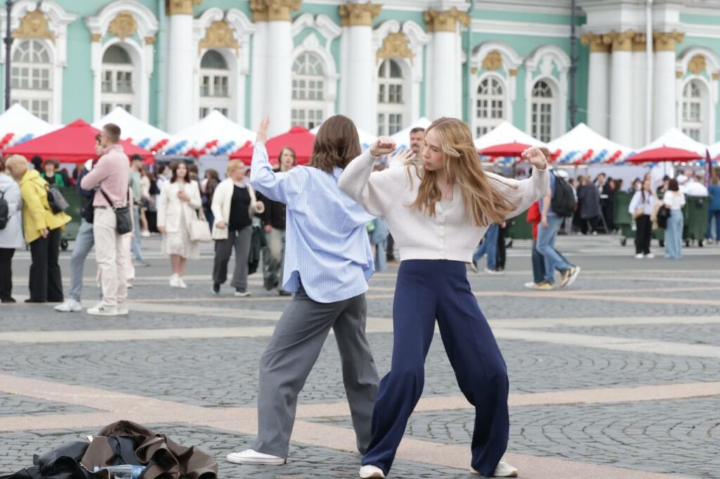 В 20:00 на Дворцовой площади появились первые зрители. Выпускники заняли удобные места, фотографировались с друзьями и согревались танцами. До выхода хедлайнеров на сцене зажигали молодежные коллективы, прошедшие кастинг. Корреспонденты Комсомольской правды поделились яркими кадрами с праздника в режиме реального времени.
