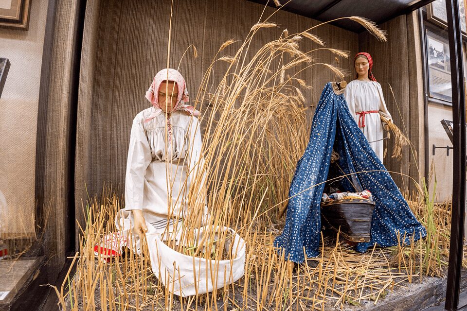 В 15:30 стартует экскурсия «Русский народный костюм», во время которой можно будет увидеть традиционную одежду XVIII – начала XX веков и уникальные образцы рукоделия: золотое и жемчужное шитье, бисероплетение, вышивку и кружево. Для юных посетителей подготовлена интерактивная программа «Баю, баю, зыбаю, отец ушел за рыбою…», где дети смогут научиться «байкать» куклу-пеленашку, сочинять колыбельные и убаюкивать игрушечных малышей.