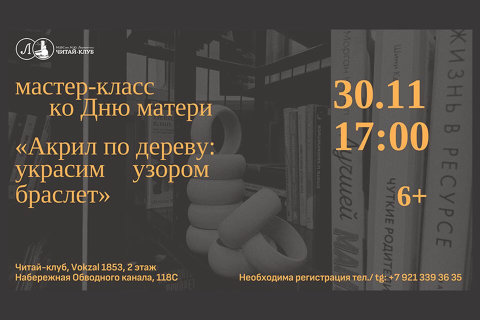 В читай-клубе Лермонтовки пространства Vokzal 1853 в День матери пройдет мастер-класс «Акрил по дереву: украсим узором браслет». Участникам предложат расписать деревянную заготовку, используя акрил, маркеры, мулине и несколько простых декоративных приемов.