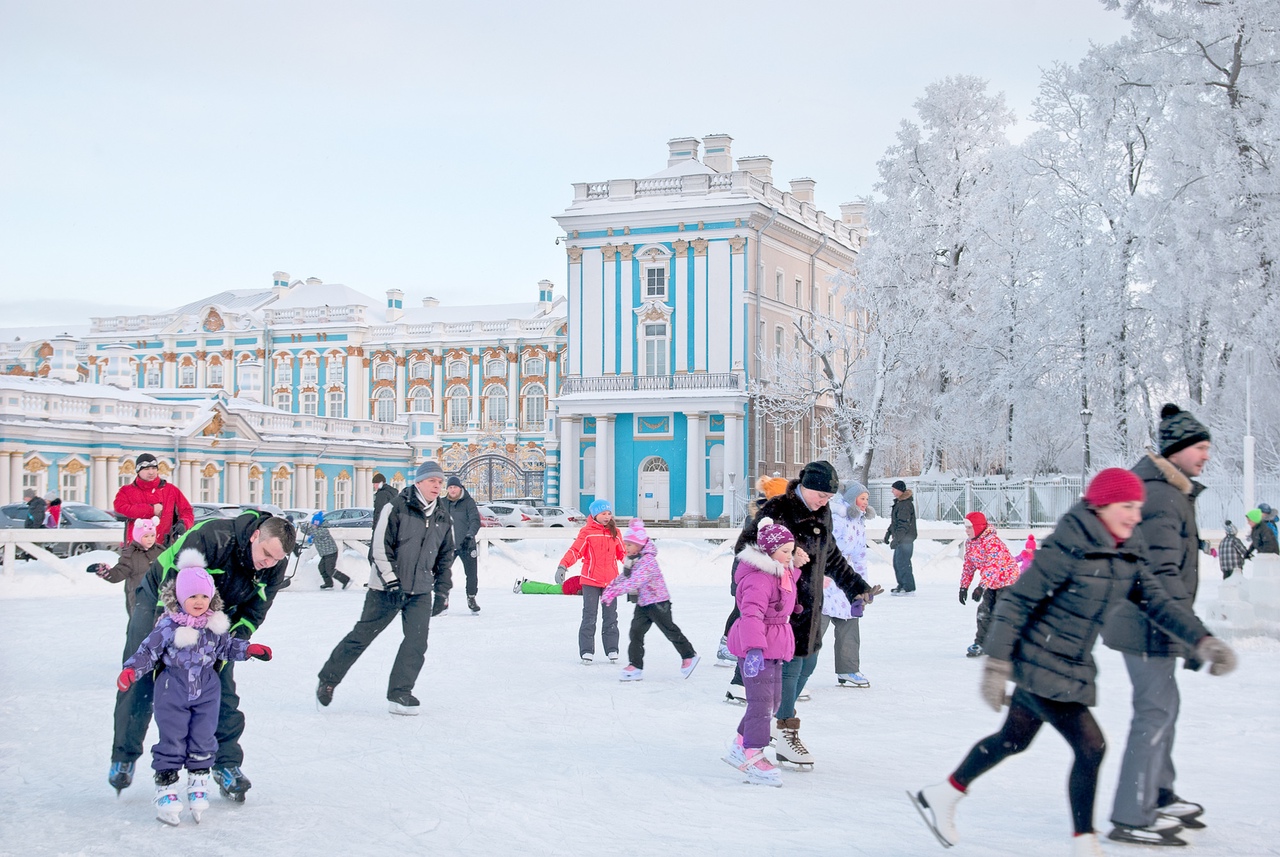 Если городские катки надоели, то можно поехать и куда-нибудь подальше. Например, в Пушкин. Перед Екатерининским дворцом на Треугольной площади каждый год заливают каток. Пускают по сеансам: один сеанс – 1 час. На территории есть теплая раздевалка, прокат инвентаря, школа катания и кафе.