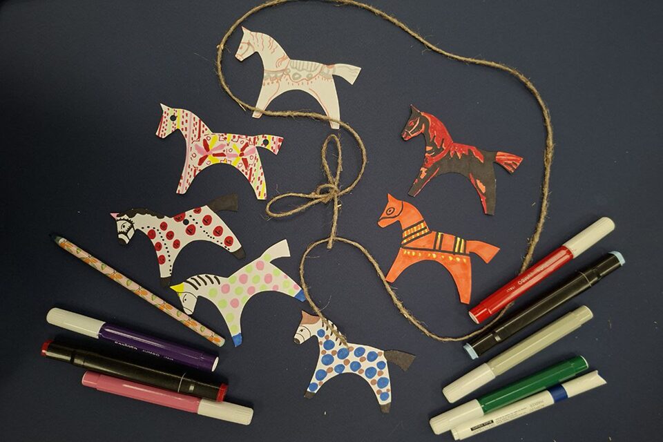 Дети и взрослые создали собственные фигурки лошадей из бумаги, раскрашивая их яркими красками и превращая в гирлянду. Каждая деталь стала частью праздничного декора, а процесс работы подарил ощущение творчества и прикосновения к народным традициям.