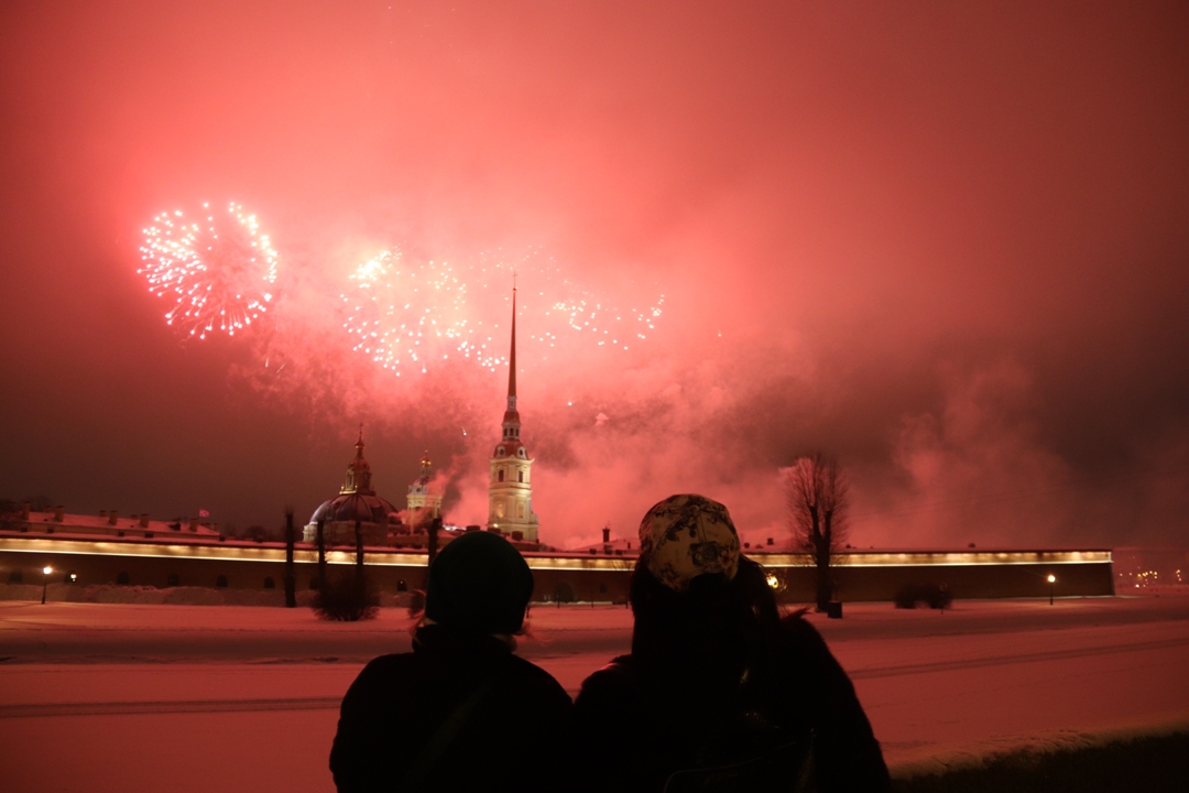 Небо над Санкт-Петербургом от залпов становится то зеленым, то золотистым, то красным.