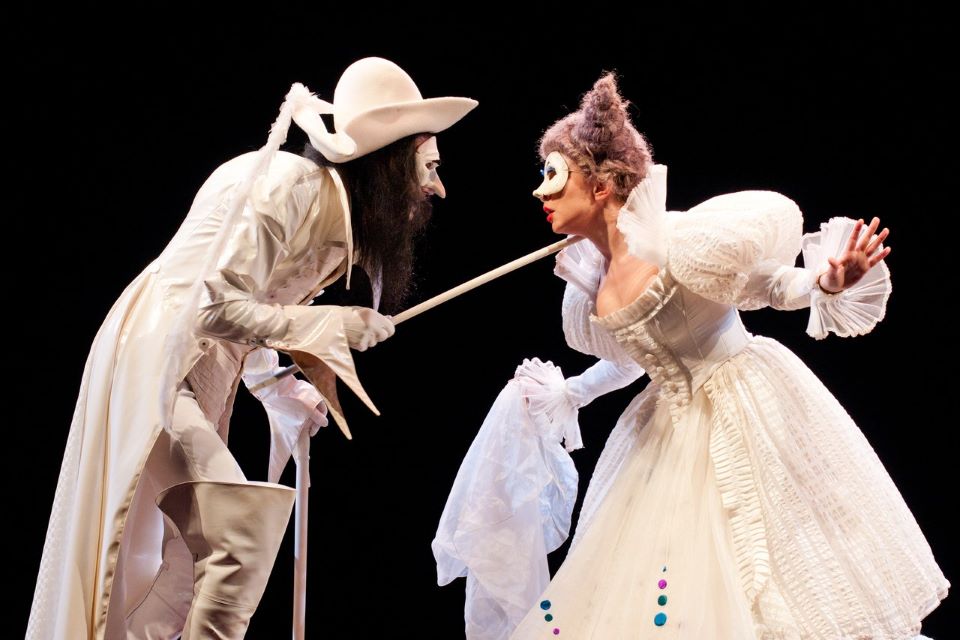 История, казалось бы, незамысловатая по сюжету, оказывается крайне необычной: среди персонажей знаменитые маски комедии дель арте — известные Тарталья, Панталоне, Смеральдина, Бригелла и Труффальдино. Именно эта компания привносит в спектакль дух откровенной пародии и буффонады. Романтичный сюжет ярко приправлен юмором и импровизацией. Необычность игры в масках, которые лишают актёров привычного существования на сцене, тоже придаёт спектаклю остроту.