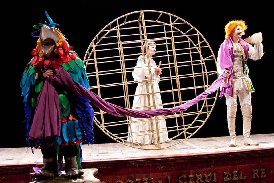 История, казалось бы, незамысловатая по сюжету, оказывается крайне необычной: среди персонажей знаменитые маски комедии дель арте — известные Тарталья, Панталоне, Смеральдина, Бригелла и Труффальдино. Именно эта компания привносит в спектакль дух откровенной пародии и буффонады.