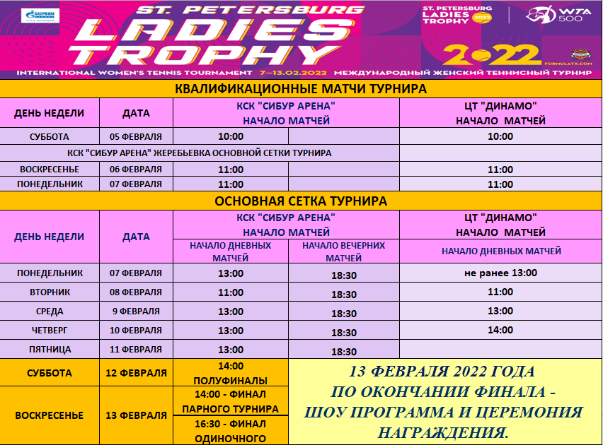 С 5 по 13 февраля 2022 года в Санкт-Петербурге прошел турнир Женской теннисной Ассоциации WTA (категория Premier 500) St. Petersburg Ladies Trophy. В нем приняли участие ведущие теннисистки мира. В основной сетке сыграли четыре спортсменки из топ-10 мирового рейтинга – чешка Каролина Плишкова (пятая ракетка мира), звезда греческого тенниса Мария Саккари (шестая), эстонка Анетт Контавейт (семдьмая) и тунисская теннисистка Онс Жабер (десятая). Организаторы пока не объявили даты проведения турнира в 2023 году.