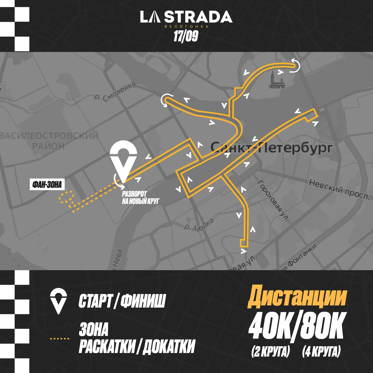 17 сентября 2023 года в Санкт-Петербурге состоится любительская велогонка La Strada. Спортсмены стартуют на площади Собчака. Время события организаторы объявят чуть позже.