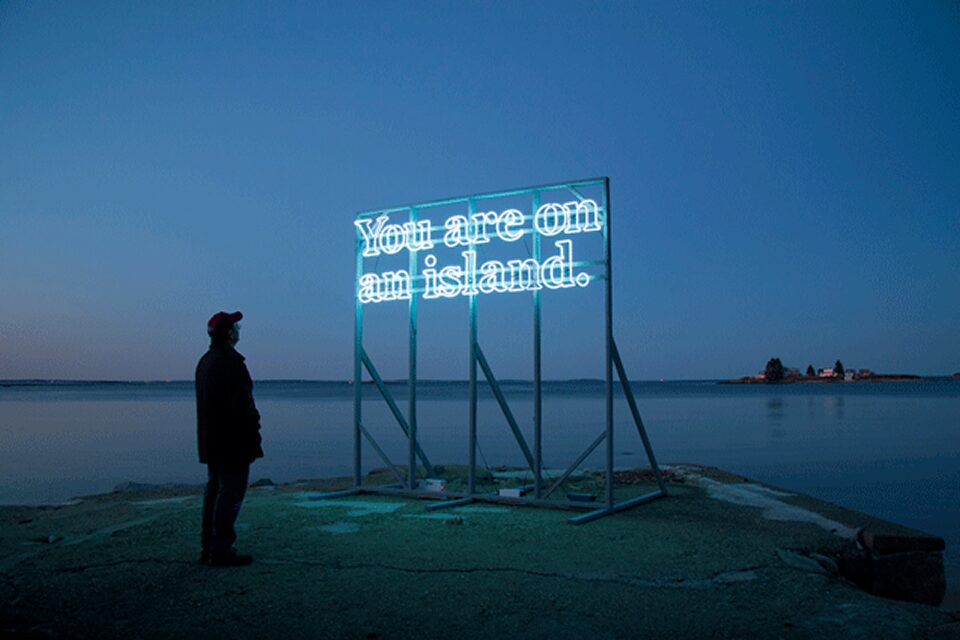 Инсталляция You are (on) an island представляет собой игру слов, подчеркнутую динамикой. Простое высказывание здесь приобретает дополнительные и противоречивые смыслы. Художница смещает фокус с географического понятия острова в сторону метафорического, политического или идеологического. Смена утверждений («ты остров» и «ты на острове») подталкивает к размышлениям о себе и о роли, которую мы играем в мире.