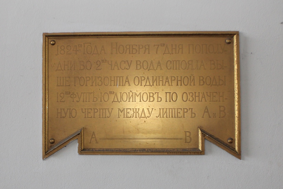 Интересно, что на фасадах зданий города можно увидеть памятные таблички, отмечающие уровень воды во время наводнения 1824 года. Одна из них установлена на перекрестке 1-й линии и Большого проспекта Васильевского острова.