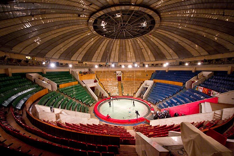 Самое оригинальное в нем — купол, над которым работали местные промышленные строители. Прежде чем построить современное здание цирка, нужно было снести старое. Здание было аварийным. Санэпидемстанция категорически запретила раздавать обломки деревянных конструкций населению на дрова, чтобы не допустить распространения грибка. Тогда пожарных попросили сжечь здание. Снимать процесс приехали четыре столичные киностудии. Кадры потом монтировали для других картин.