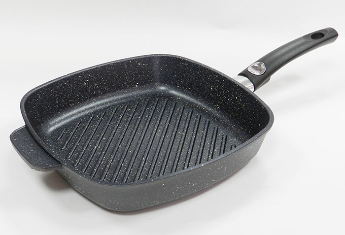 Качественное антипригарное покрытие, толстое дно и стенки, достаточно высокие ребра, удобные ручки из жаропрочного материала, которые не позволят обжечь руки, - все это не просто отличает