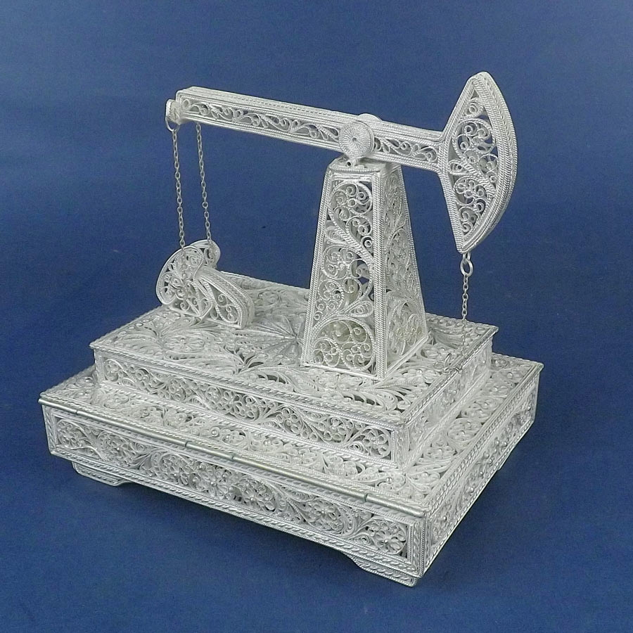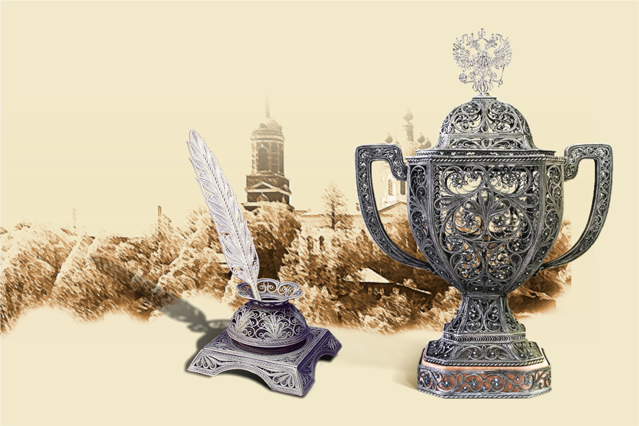 богатый ассортимент филигранных новинок, который постоянно обновляется и расширяется художниками предприятия. Сегодня это декоративные панно, вазы и чаши, конфетницы и подстаканники, наборы чайных ложек, шкатулки различной конфигурации и женские украшения, презентационные плакетки, визитницы, спортивные кубки, письменные наборы и многое другое. На изделие можно поместить символику и геральдику, а также изготовить его из серебра 925 пробы.