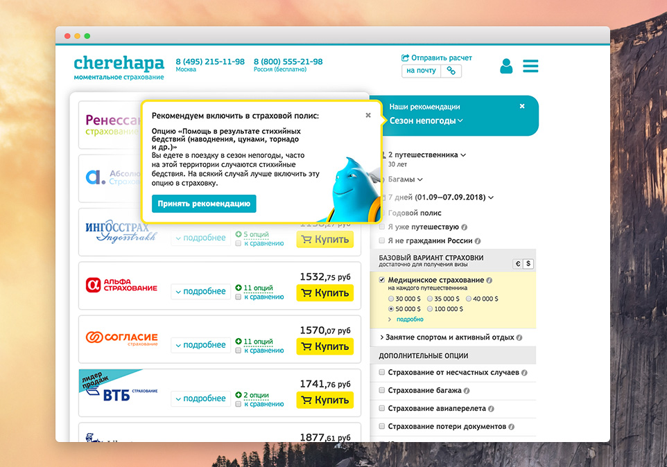 Он сэкономит вам время и избавит от мороки с лишними бумажками. Едете отдыхать с семьёй или с друзьями? На cherehapa.ru можно оформить полис для всех участников поездки на одном бланке и страховая сумма при этом не будет делиться на несколько человек!