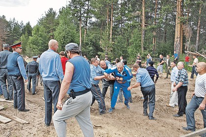 Что мне делать было? Взял с собой родственников, 12 человек, покатили в Демьяново. Приехали, легли спать - устали очень в пути. Утром, то есть после обеда, хотели выйти поговорить с народом, чтобы все мирно решить. А вместо этого мне племянник говорит, что у ворот пилорамы стоят люди с палками. Я подъехал туда, там уже полиция бежит и говорит, что в обход люди пошли, на вас нападать будут, бегите отсюда. Я спросил: «Вы не в силах остановить их? Мне ответили: «Нет». Говорю - тогда мы остановим. Сказал своим брать все что есть и бежать к пилораме. Сам взял ружье - я же не хотел умирать! Вскочил на бревна и увидел, что 200 человек на нас прет. Выстрелил в воздух, половина убежала. Пьяные парни столкнулись с нашими. Мы им отпор дали, отбросили их. В этот момент наша доблестная полиция между нами встала, отгородила.