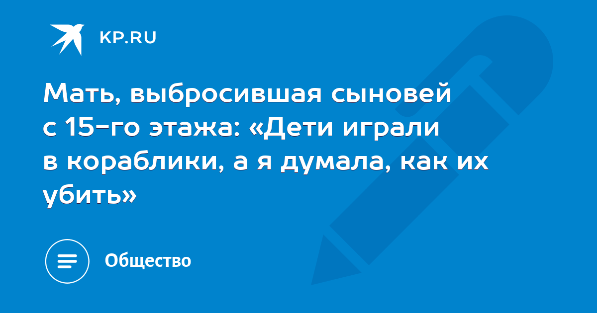 До утра 24-го не спала, думала. А утром, после 11.00 решила убить себя и детей. Налила в ванную воду, позвала детей купаться. Потом взяла удлинитель, с розетками. Включила вилку в розетку, взяла в руки другой его конец с розетками и села с сыновьями в воду. Нажала включатель и погрузила его в воду. Но ничего не произошло, просто выключился свет и выбило пробки. Я вышла в прихожую, включила рубильник. Я взяла в ванной черный фен, вставила вилку в розетку, и взяла его с собой в ванную. Включила его и погрузила под воду. Но опять выбило пробки. Током нас не ударило. Дети играли в кораблики, а я опять думала. Думала, что нужно убить их, так как если первой убью себя, то они точно никому не будут нужны. Тогда я отвела их на 15-й этаж, вышла на балкон. Когда Вова отвернулся, я подняла Родиона и быстро перебросила через него вниз. Я не смотрела туда. Потом подняла Вову. Он все понял, стал кричать и плакать. Я ему сказала, что так надо, сказала: "Прости, сынок". Потом села на парапет балкона, свесила ноги вниз. Но храбрости не хватило. Внизу еще бегал какой-то мужчина и кричал, что я дура и махал мне руками. Я не стала прыгать.