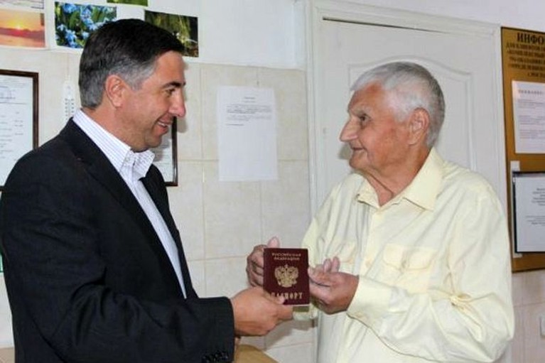Владимир Бунин (справа) после «воскрешения» получает паспорт.