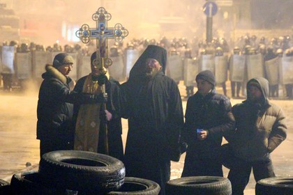 Вместо намаза — христианская молитва. И трое православных священников, стоящих между «Беркутом» и баррикадой