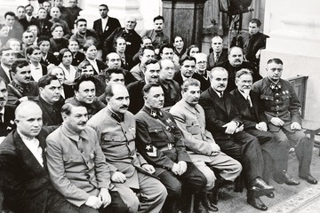 Декабрь 1936 года. На Всесоюзном съезде Советов (первый ряд, слева направо) Хрущев, Жданов, Каганович, Ворошилов, Сталин, Молотов, Калинин и Тухачевский принимали сталинскую Конституцию. А через полгода крайнего справа сделают крайним... Фото: Фотохроника ТАСС