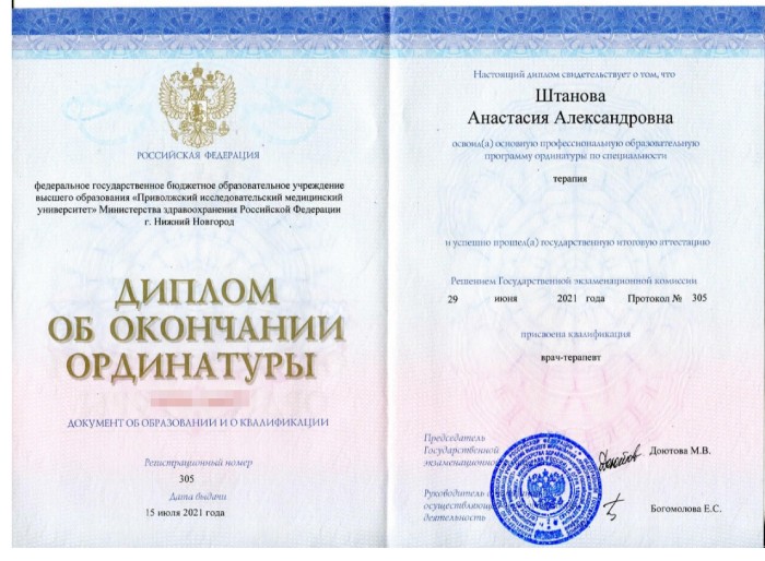 2019-2021 год – ординатура в ПИМУ по специальности «терапия».