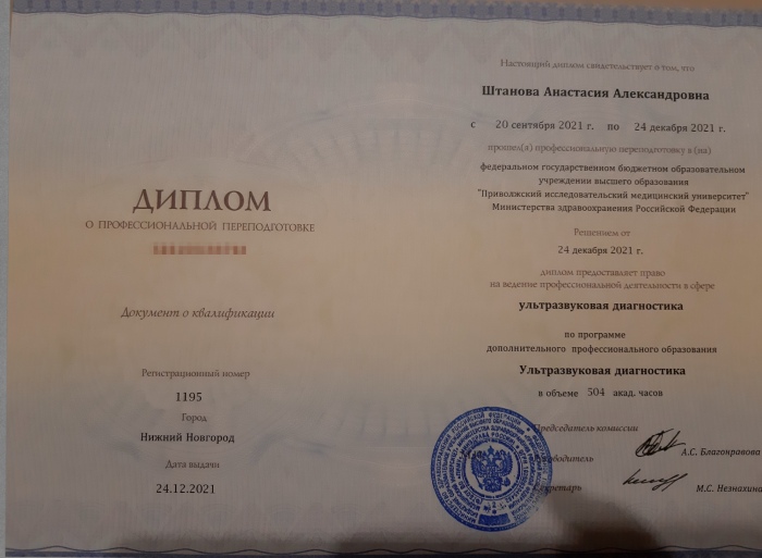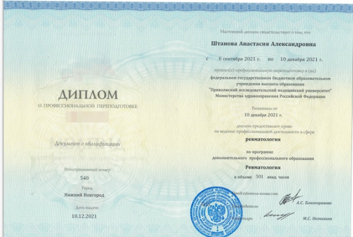 2021 год – профессиональная переподготовка по специальностям «ревматология» и «УЗИ».