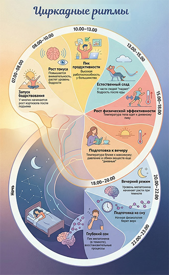 Циркадные ритмы – это внутренние биологические часы организма, которые работают с периодом около 24 часов и синхронизируют работу всех органов с циклом «день-ночь»2.