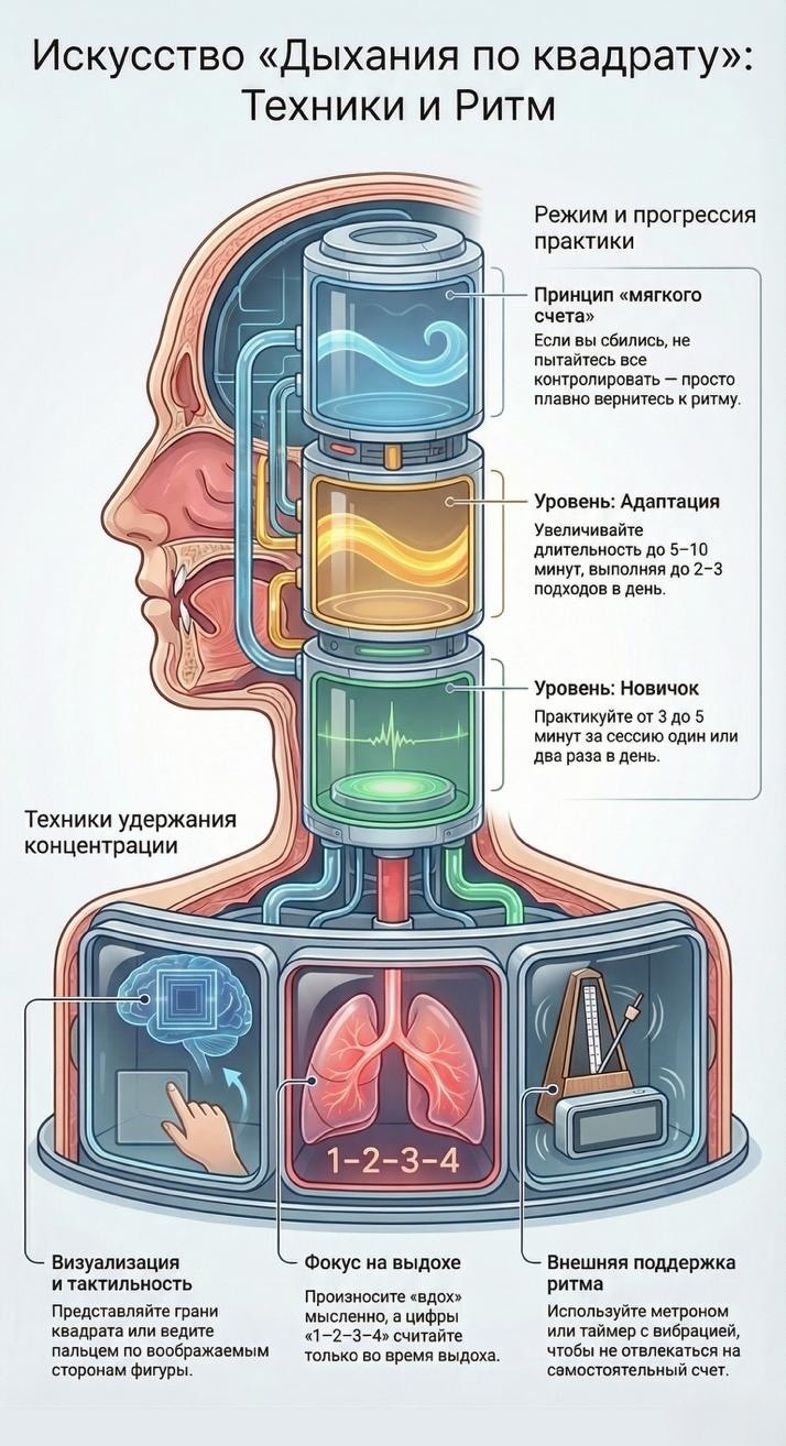 – В технике дыхания по квадрату важно не точное число, а ритм и равномерность – именно это запускает физиологическую реакцию успокоения.