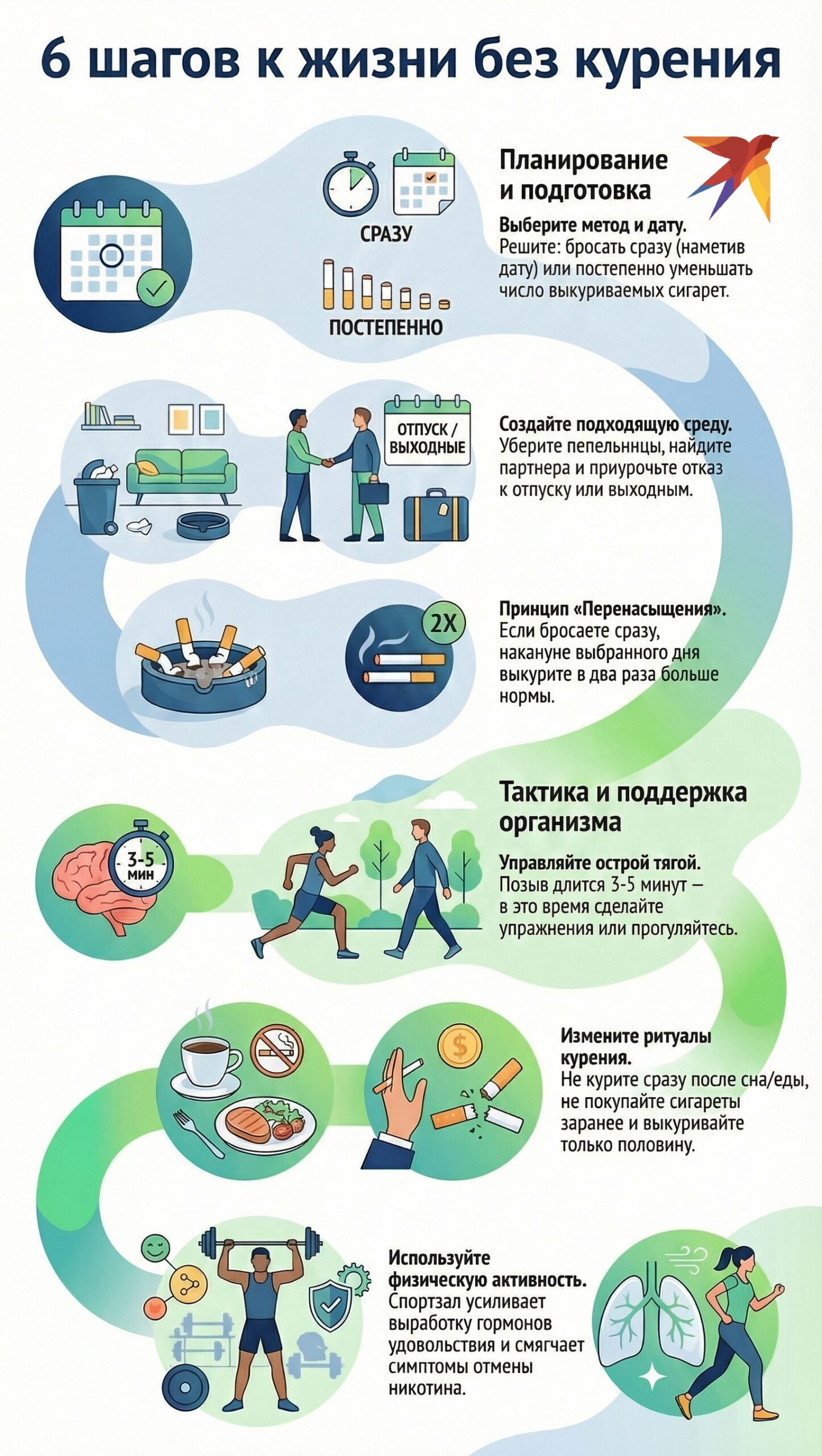 - Если решите бросить курить сразу, заранее наметьте дату, когда вы это сделаете. Постарайтесь приурочить это к значимому для вас событию. Накануне этого дня курите в два раза больше, чтобы перенасытить организм никотином.