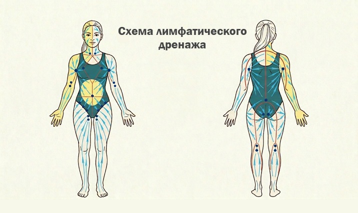 - Для домашних условий подойдет упрощенная техника самомассажа: легкими поглаживаниями «гоните» лимфу по направлению к подмышечным и паховым впадинам, как на схеме.